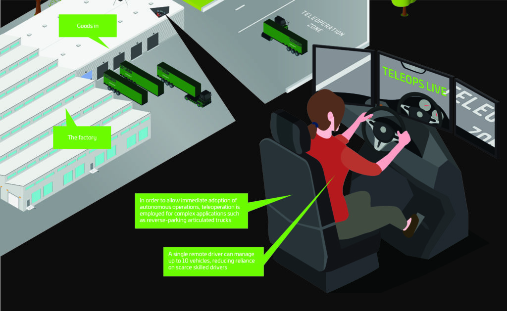 Located either onsite or remotely, the teleoperations driver, courtesy of low latency, high-speed connectivity to the vehicle’s operating systems, is able to perform the reverse parks using onboard cameras and sensors from a driving pod configured to resemble a typical HGV cab with surround screens replacing the driver’s view through the cab windscreen. While teleoperations stops short of full automation, each teleops driver is capable of managing a fleet of up to ten trucks and thus makes a significant contribution to the automation productivity objective.